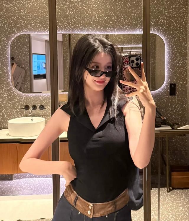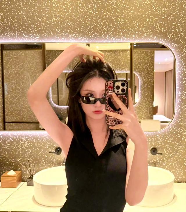 只见这张照片中乔欣身穿挂脖背心,戴着墨镜,搭配上手中的豹纹手机壳,一整套造型辣妹又复古。