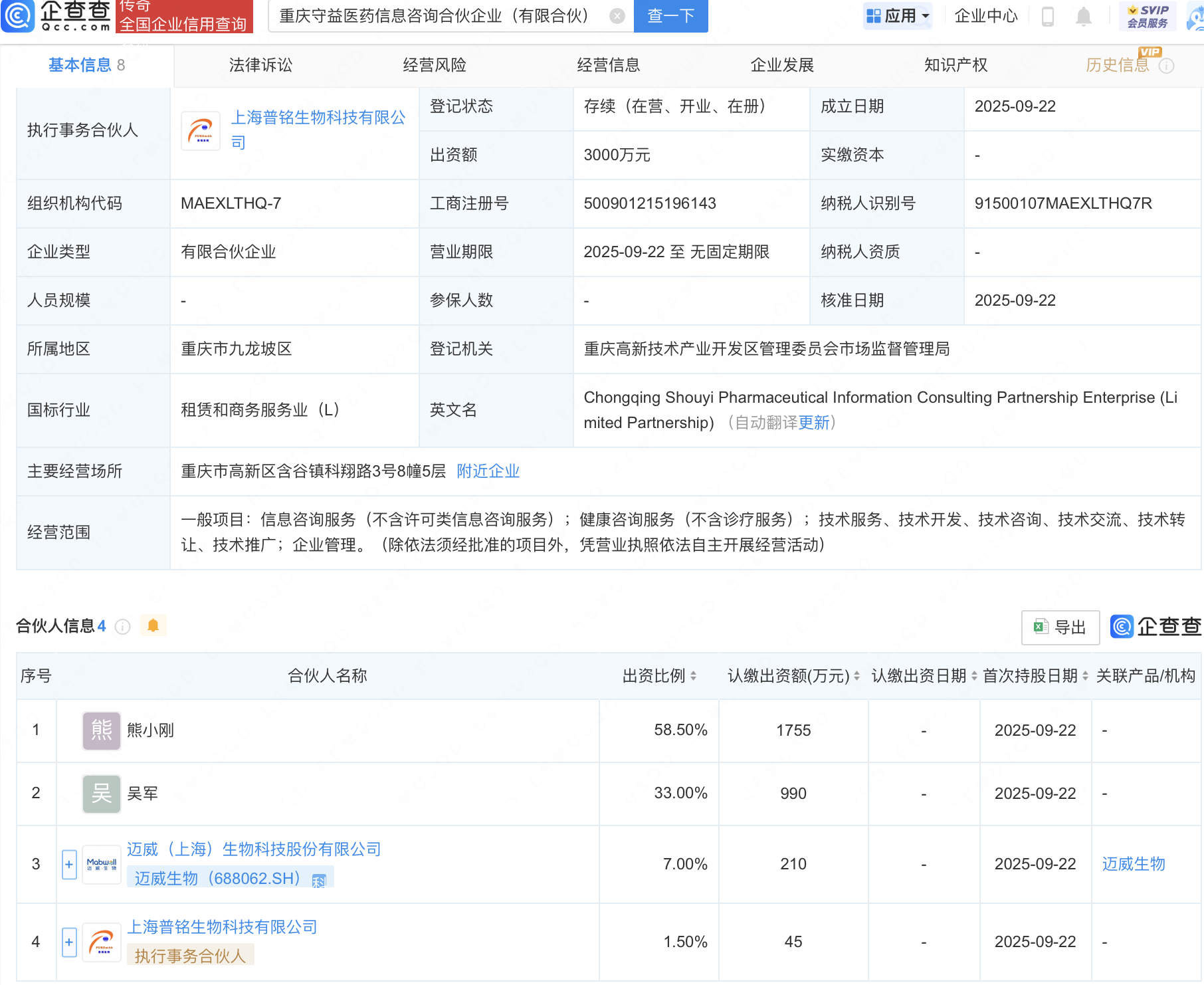 近日,重庆守益医药信息咨询合伙企业(有限合伙)成立,出资额3000万元,经营范围包含:信息咨询服务(不含许可类信息咨询服务);健康咨询服务(不含诊疗服务)等。企查查股权穿透显示,该公司由迈威生物(688062)等共同出资。